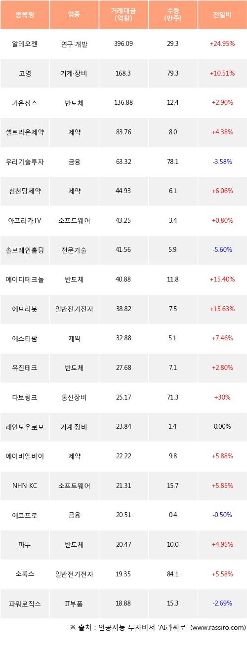 알테오젠, 고영, 가온칩스 등은 전일 대비 주가가 상승했고, 우리기술투자, 솔브레인홀딩스, 에코프로 등은 주가가 하락했다.