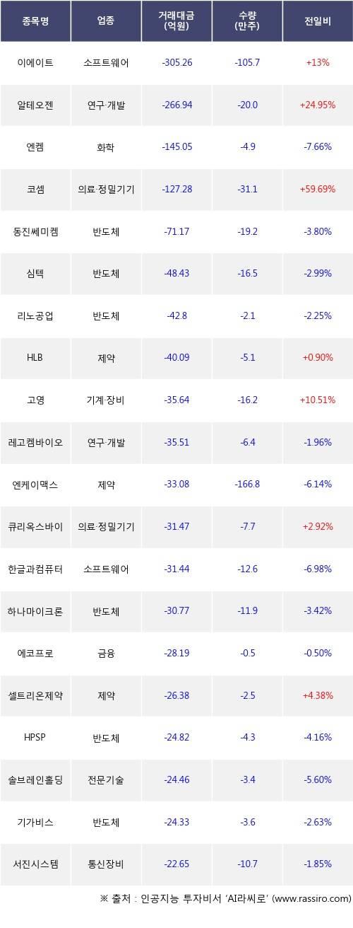 기관 투자자의 순매도 상위 20개 종목은 이에이트, 알테오젠, 엔켐, 코셈, 동진쎄미켐, 심텍, 리노공업, HLB, 고영, 레고켐바이오등이다.