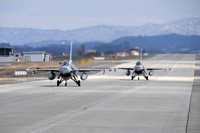 [서울=뉴시스] 홍효식 기자 = 공군이 23일 한미 공군의 5세대 전투기인 F-35A를 포함해 F-15K, KF-16 등 다수의 전투기가 참가하는 연합공중훈련을 실시했다고 밝혔다. 사진은 훈련에 참가한 한국 공군 KF-16 전투기가 청주기지에서 이륙을 위해 유도로 위를 활주하고 있는 모습. (사진=공군 제공) 2024.02.23. photo@newsis.com *재판매 및 DB 금지