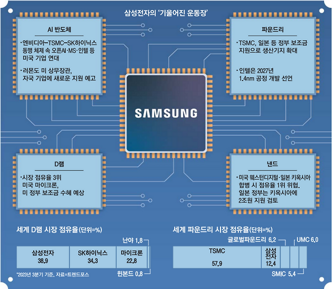 이같은 주요국의 보조금 경쟁과 자국기업 선호 분위기는 삼성전자에 있어 위협요인이 되고 있다. 특히 메모리 반도체 사업이 대부분이고 엔비디아 동맹에 합류한 SK하이닉스에 비해 삼성전자가 받는 위협은 더 전방위적이다.
