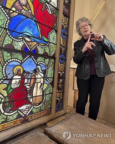 FILE - Holy Cross professor and stained-glass expert Virginia Raguin speaks to a group of middle school students, Monday, May 1, 2023, while standing near a nearly 150-year-old stained-glass window that depicts Christ speaking to a Samaritan woman, in the now-closed St. Mark's Episcopal church, in Warren, R.I. The nearly 150-year-old stained-glass church window in Rhode Island that depicts a dark-skinned Jesus Christ interacting with women in New Testament scenes has found a new home at a museum in Tennessee. (AP Photo/Mark Pratt, File) FILE