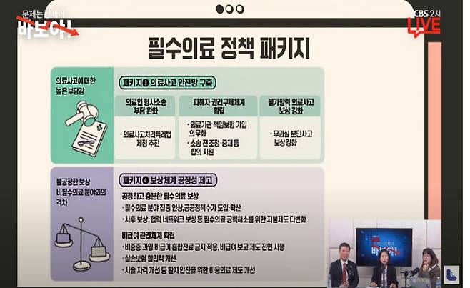 ◇조승연> 두 가지 방법이 있는데 하나는 돈으로 조절(수가 체계 개선 등) 하는 거고요. 다른 하나는 강제성, 이 양축이 같이 가야 됩니다. 공공의대나 지역의사제 같은 것이 들어가서 대우를 잘해주고 학비도 다 대주고 나와서 좋은 자리를 보내준다 하면 사람들이 공공의대를 서로 가고 싶어 할 거 아니에요. 그 정도 만들어야 이게 표준 모델이 되는 거예요. 지역의사제의 경우도 지역에서 남아서 10년을 복무하겠다고 약속을 한 사람을 뽑아서 장학금 줘서 키운 다음 복무를 하게 하는데, 이걸 싼 임금에 쓰려는 게 아니라 실제로 보람을 느끼게 해주는 정책이 따라가야죠.