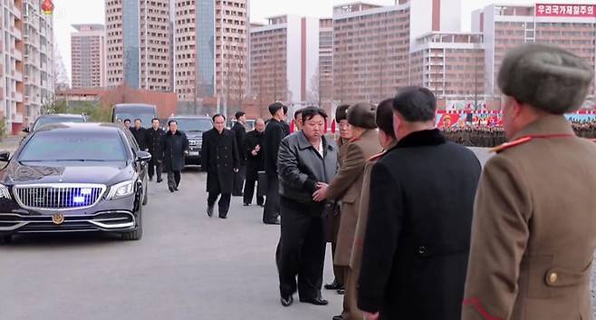 [서울=뉴시스] 김정은 북한 국무위원장이 지난 23일 평양 화성지구에서 열린 1만 세대 살림집(주택) 3단계 건설 착공식에 참석해 발파 단추를 눌렀다고 조선중앙TV가 24일 보도했다. (사진=조선중앙TV 캡처) 2024.02.24. photo@newsis.com *재판매 및 DB 금지