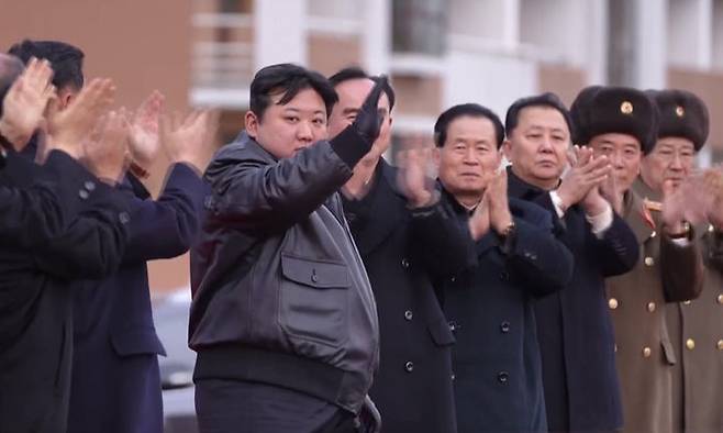 [서울=뉴시스] 김정은 북한 국무위원장이 지난 23일 평양 화성지구에서 열린 1만 세대 살림집(주택) 3단계 건설 착공식에 참석해 발파 단추를 눌렀다고 조선중앙TV가 24일 보도했다. (사진=조선중앙TV 캡처) 2024.02.24. photo@newsis.com *재판매 및 DB 금지