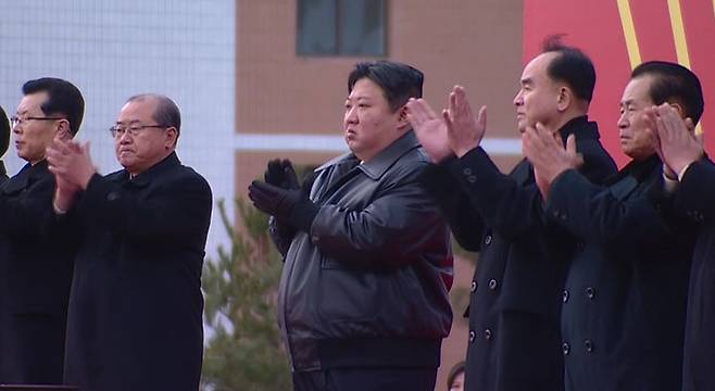 [서울=뉴시스] 김정은 북한 국무위원장이 지난 23일 평양 화성지구에서 열린 1만 세대 살림집(주택) 3단계 건설 착공식에 참석해 발파 단추를 눌렀다고 조선중앙TV가 24일 보도했다. (사진=조선중앙TV 캡처) 2024.02.24. photo@newsis.com *재판매 및 DB 금지