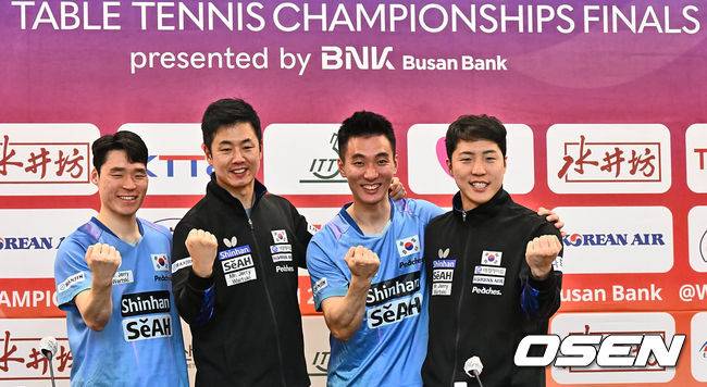 주세혁 대한민국 남자탁구 감독과 장우진, 이상수, 임종훈이 준결승을 끝내고 가진 기자회견에서 포토타임을 갖고 있다. 2024.02.24 / foto0307@osen.co.kr