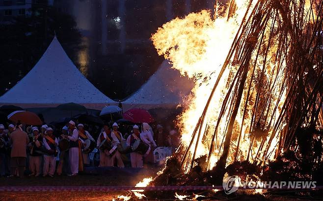 (전주=연합뉴스) 나보배 기자 = 정월대보름인 24일 전북 전주시 완산구 삼천동 전주기접놀이전수관 인근에서 열린 정월대보름 굿 '망월이야' 행사에서 시민들의 소원지를 매단 달집태우기가 펼쳐지고 있다. 2024.2.24