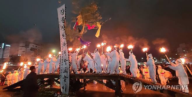 (강릉=연합뉴스) 유형재 기자 = 24일 강원 강릉시 남대천 둔치에서 열린 '2024 강릉 망월제'에서 다리를 밟는 전통 민속놀이인 하평답교놀이가 펼쳐지고 있다. 2024.2.24