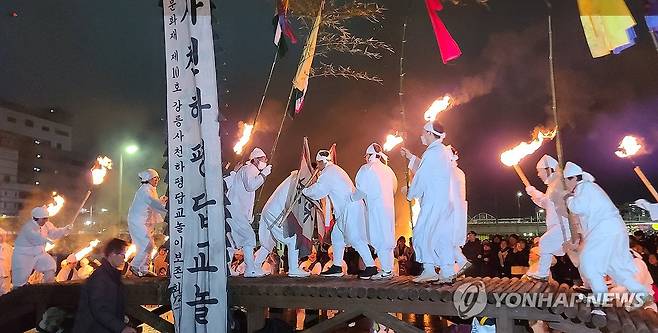 (강릉=연합뉴스) 유형재 기자 = 24일 강원 강릉시 남대천 둔치에서 열린 '2024 강릉 망월제'에서 다리를 밟는 전통 민속놀이인 하평답교놀이가 펼쳐지고 있다. 2024.2.24