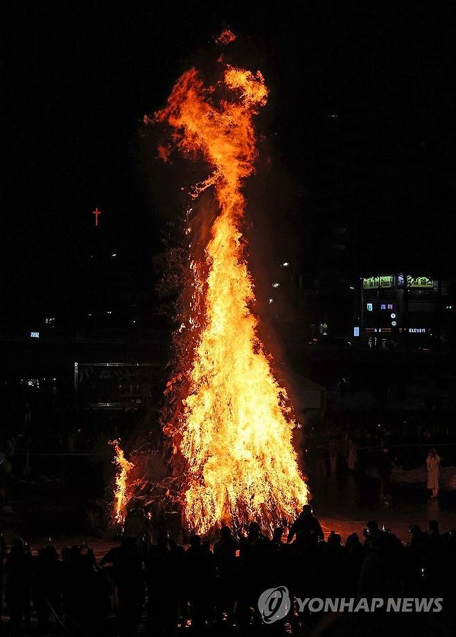 (강릉=연합뉴스) 유형재 기자 = 24일 강원 강릉시 남대천 둔치에서 열린 '2024 강릉 망월제'에서 액을 쫓고 복을 부르는 달집태우기 행사가 열리고 있다. 2024.2.24