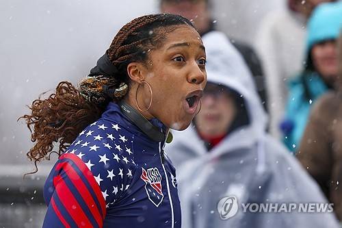 epa11177119 Sylvia Hoffman of USA reacts after the second run of the women's mono bobsleigh World Championship in Winterberg, Germany, 24 February 2024. EPA/CHRISTOPHER NEUNDORF