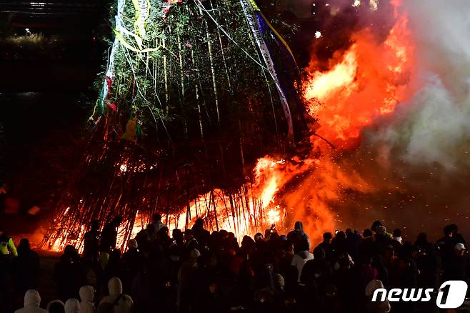 (포항=뉴스1) 최창호 기자 = 24일 경북 포항시 남구 해도동 형산강 체육공원에서 열린 정월대보름 달집태우기 행사를 찾은 시민들이 활활 타오르는 달집에 소원을 빌고 있다.