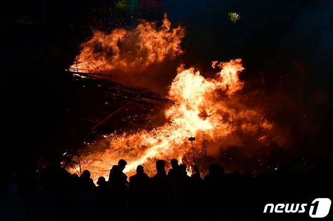 (포항=뉴스1) 최창호 기자 = 24일 경북 포항시 남구 해도동 형산강 체육공원에서 열린 정월대보름 달집태우기 행사를 찾은 시민들이 활활 타오르는 달집에 소원을 빌고 있다.