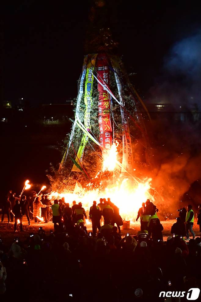 (포항=뉴스1) 최창호 기자 = 24일 경북 포항시 남구 해도동 형산강 체육공원에서 열린 정월대보름 달집태우기 행사에서 시민들이 활활 타오르는 달집에 소원을 빌고 있다. 2024.2.24/뉴스1