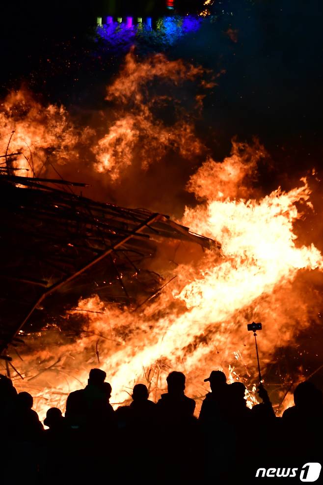 (포항=뉴스1) 최창호 기자 = 24일 경북 포항시 남구 해도동 형산강 체육공원에서 열린 정월대보름 달집태우기 행사를 찾은 시민들이 활활 타오르는 달집에 소원을 빌고 있다.