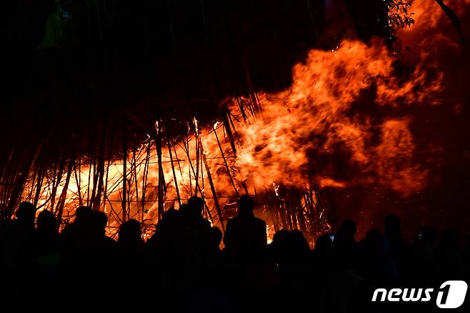 (포항=뉴스1) 최창호 기자 = 24일 경북 포항시 남구 해도동 형산강 체육공원에서 열린 정월대보름 달집태우기 행사를 찾은 시민들이 활활 타오르는 달집에 소원을 빌고 있다.
