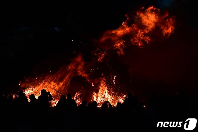 (포항=뉴스1) 최창호 기자 = 24일 경북 포항시 남구 해도동 형산강 체육공원에서 열린 정월대보름 달집태우기 행사를 찾은 시민들이 활활 타오르는 달집에 소원을 빌고 있다. 2024.2.24/뉴스1