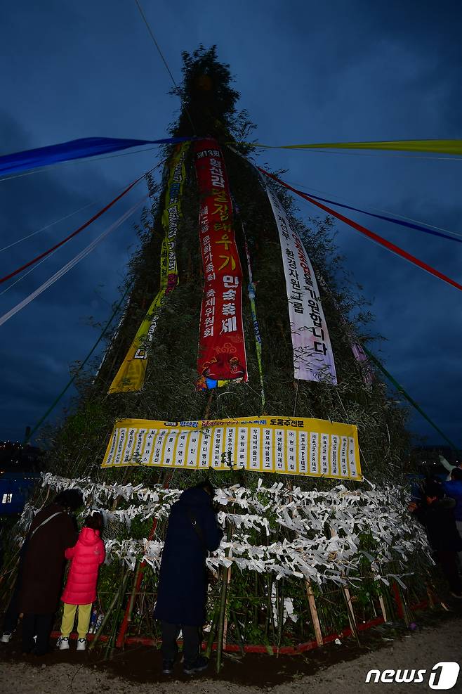 (포항=뉴스1) 최창호 기자 = 24일 경북 포항시 남구 해도동 형산강 체육공원에서 열린 정월대보름 달집태우기 행사를 찾은 시민들이 달집에 소원지를 달고 있다. 2024.2.24/뉴스1