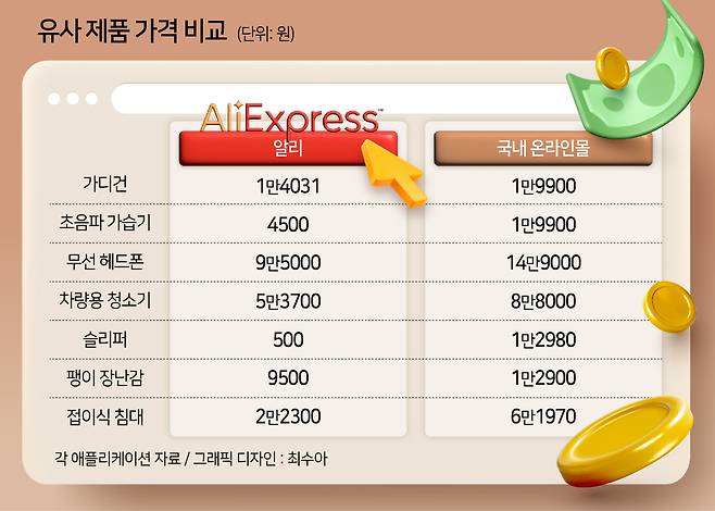 실제 유사한 카디건 제품은 국내 이커머스에서는 1만9900원에, 알리익스프레스에서는 1만4000원에 팔리고 있다. 같은 로고가 박힌 슬리퍼도 알리익스프레스에서는 500원에 살 수 있지만, 국내 이커머스에서는 1만원이 넘는 가격에 판매한다.