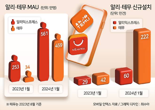 모바일인덱스에 따르면 지난달 알리익스프레스의 ‘월간 활성화 이용자 수(MAU·한달간 앱을 이용한 순수 이용자 수)’는 561만명이었다. 1년 전(253만 명)보다 121.7% 늘었다. 테무는 국내에 앱을 선보인 작년 8월 34만명에서 5개월 만인 지난달 459만명으로 1250% 늘었다. 앱 신규 설치 건수를 봐도 알리익스프레스와 테무는 같은 기간 각각 106.9%(29만 건→60만 건), 428.6%(42만 건→222만 건) 급증했다.