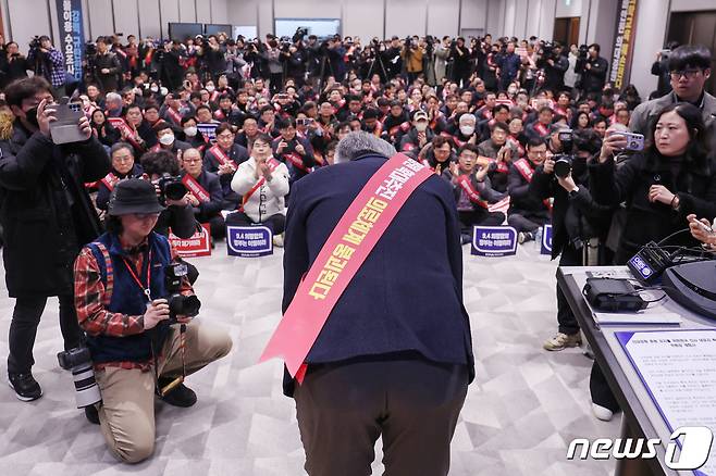 (서울=뉴스1) 민경석 기자 = 김택우 의대정원 증원 저지를 위한 대한의사협회(의협) 비상대책위원장이 25일 오후 서울 용산구 의협회관에서 열린 '전국 의사 대표자 확대 회의'에서 회원들 앞에 허리 숙여 인사하고 있다. 2024.2.25/뉴스1