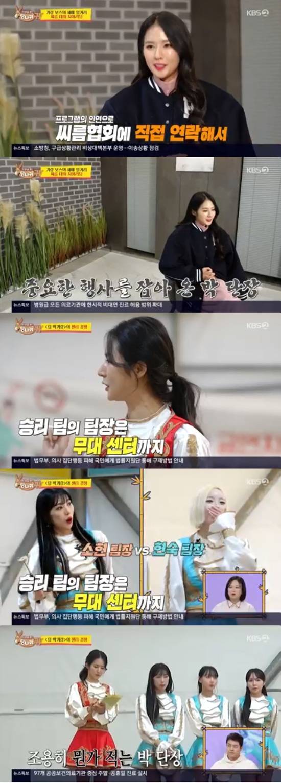박기량은 본 행사에 앞서 단원들을 데리고 씨름장을 찾았는데 단원들은 소현 팀과 현숙 팀으로 나뉜 상태였다.