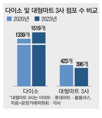 25일 공정거래위원회 가맹사업정보제공시스템에 따르면 지난해 다이소 매장은 직영점 1022개, 가맹점 497개로 총 1519개다. 이는 2020년 1339개에서 3년 만에 180개 늘어난 수치다. 같은 기간 이마트·롯데마트·홈플러스 같은 대형마트 3사의 점포는 423개에서 396개로 오히려 27개 줄었다. 지난해 이마트와 롯데마트의 매출이 각각 전년 동기 대비 2% 이상 줄어든 반면, 다이소는 10%가량 성장하며 3조원을 돌파한 것으로 추정된다.