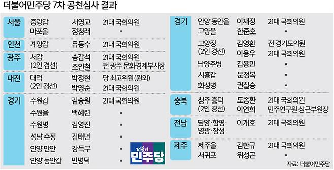 민주당 임혁백 공관위원장은 서울 여의도 중앙당사에서 브리핑을 열고 서울·경기 등 수도권 일부와 충북·전남·제주권 21개 지역구에 대한 공천심사 결과를 발표했다.