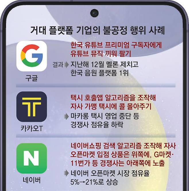 카카오, 네이버와 같은 국내 플랫폼 기업의 불공정 행위 역시 이어지고 있다. 카카오모빌리티는 자사 가맹 택시에는 콜(승객 호출)을 몰아주고 경쟁사로 가는 콜은 차단하다 적발됐다. 카카오스타일도 입점 업체들에 ‘우리 플랫폼에서만 할인 행사를 하라’고 강요한 혐의로 공정위의 조사를 받고 있다. 네이버도 과거 검색 알고리즘을 조작해 자사 오픈마켓인 ‘스마트 스토어’ 입점 업체를 상단에 노출했다가 공정위로부터 200억 원대 과징금을 부과받은 바 있다.