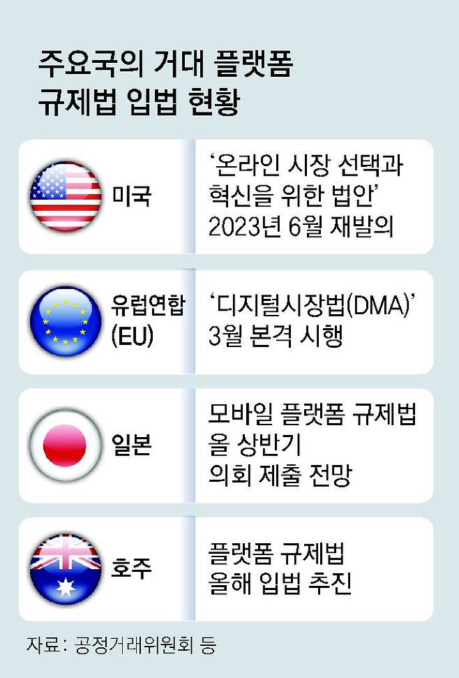 거대 플랫폼 기업을 규제하려는 움직임은 미국이나 한국에서만 벌어지고 있는 일은 아니다. 유럽은 이미 비슷한 법을 만들어 다음 달 시행을 앞두고 있고, 일본, 호주 등에서도 공룡 플랫폼 규제와 관련한 입법 바람이 불고 있다. 전 세계적으로 플랫폼 패권을 둘러싼 경쟁이 심화되고 이에 따른 ‘반칙’ 행위도 빈번해지자 각국이 대응 마련에 나선 것이다.》