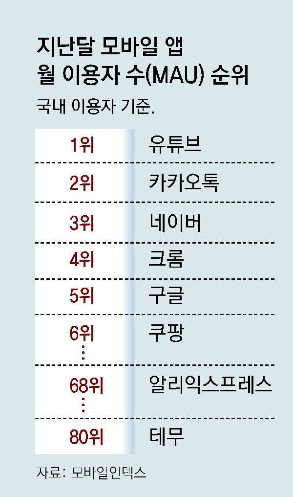 국내에서도 플랫폼 시장의 지각변동은 현재진행형이다. 중국 이커머스 알리익스프레스, 테무는 한국에서도 공격적인 영업을 시작하면서 영향력을 확대하고 있다. 앱 분석 업체 아이지에이웍스의 모바일인덱스에 따르면 지난달 알리익스프레스 앱 이용자(MAU·한 달에 한 번은 서비스를 쓴 이용자)는 전체 모바일 앱 중 68번째로 많았다. 지마켓(72위), 무신사(77위) 이용자보다 많은 규모다. 테무 이용자 순위는 한 달 전보다 22단계 올라선 80위로 100대 모바일 앱에 진입했다.