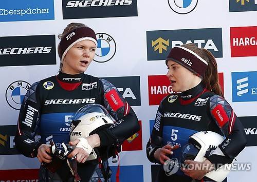 epa11180499 Anda Upite and Zane Kaluma of Latvia react after the Sprint Women's Doubles race at the FIL Luge World Cup in Sigulda, Latvia, 25 February 2024. EPA/TOMS KALNINS