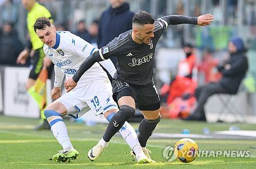 epa11180495 Juventus' Josip Kostic (R) and Frosinone's Nadir Zortea in action during the Italian Serie A soccer match Juventus FC vs Frosinone Calcio at the Allianz Stadium in Turin, Italy, 25 February 2024. EPA/Alessandro Di Marco