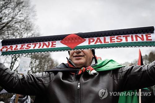 epa11180480 A man holds a banner during a rally in support of the Palestinian people under the slogan 'Let's stop the genocide', in the town of Pamplona, northern Spain, 25 February 2024. Thousands of Israelis and Palestinians have been killed since the militant group Hamas launched an unprecedented attack on Israel from the Gaza Strip on 07 October 2023, and the Israeli strikes on the Palestinian enclave which followed it. EPA/VILLAR LOPEZ