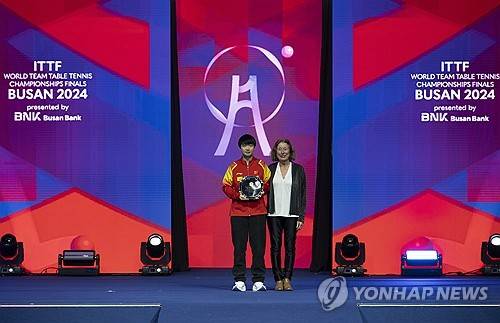 epa11180451 Sun Yingsha (L) of China pose with the Diane Schoeler award of the 2024 ITTF World Team Table Tennis Championships Finals at Busan Exhibition and Convention Centre in Busan, South Korea, 25 February 2024. EPA/JEON HEON-KYUN