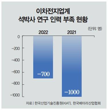 국내 이차전지업계는 특히 기술 리더십 확보와 직결된 석박사급 연구 인력 구인에 애로를 겪고 있다. 산업통상자원부 산하 한국산업기술진흥원(KIAT)이 지난해 말 조사한 '유망 신산업 인력 수급 통계'에 따르면 2022년 국내 이차전지업계의 석박사 연구개발(R&D) 인력은 약 9400명으로 전체 수요에 700명가량 못 미친 것으로 집계됐다(그래프 참조). 한국배터리산업협회가 진행한 2021년 조사에서도 석박사 R&D 인력은 1000명 이상 부족한 것으로 나타났다.