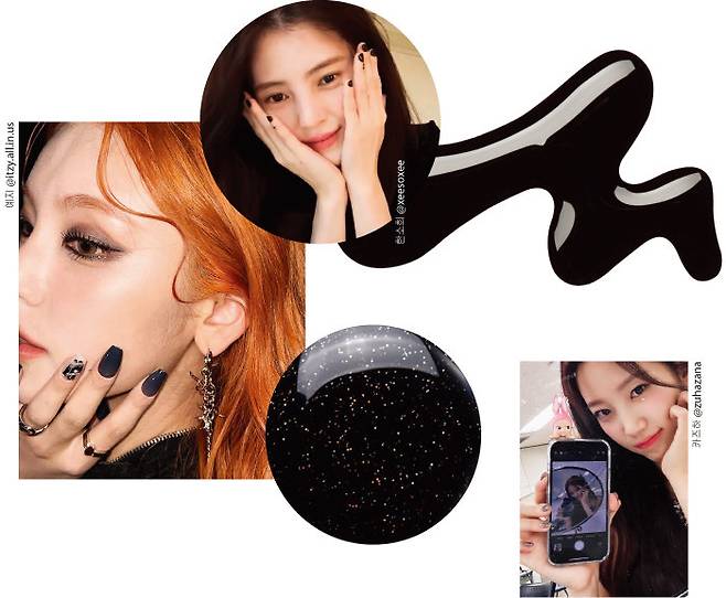 라운드 셰이프 위를 가득 채운 블랙 컬러. 디자인이나 장식 없이 원 컬러 풀 코트 네일일지라도, 강렬한 컬러라 그 자체가 포인트다. 한소희는 손톱을 꽉 채운 블랙 네일에 손가락에도 블랙 패턴을 표현해 트렌디한 네일 아트를 선보였다. 블랙 네일을 우아하게 표현하고 싶다면 ITZY(있지)의 예지처럼 주얼 장식으로 포인트를 주면 좋다. 블랙 컬러를 베이스로 반짝이는 글리터를 듬뿍 얹으면 부담스럽지 않게 블랙 네일의 변주를 즐길 수 있다.