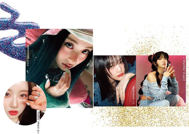 긴 손톱을 캔버스 삼아 다채로운 컬러와 스톤으로 장식한 주얼 네일도 눈에 띈다. 스테이씨 시은, (여자)아이들 민니는 가느다란 실버 베이스 네일에 블링블링한 크리스털 스톤을 붙여 화려한 네일을 연출했고, 르세라핌 허윤진은 긴 스퀘어 모양의 파스텔 네일에 실버 파츠를 붙여 포인트를 줬다. 보다 아티스틱하고 볼륨감 있는 네일을 원한다면 김채원의 SNS를 참고할 것. 네일 위에 사랑스러운 캐릭터와 주얼을 함께 스타일링해 네일 자체를 패션의 요소로 신분 상승시켰다.
