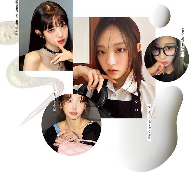 뉴진스 해린처럼 불투명한 화이트 컬러로 손톱을 채색하거나 에스파 지젤처럼 손톱 끝부분에만 화이트 컬러를 발라 프렌치 스타일로 연출하면 깔끔한 봄 네일을 완성할 수 있다.