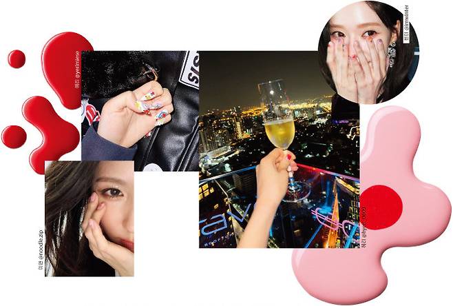 사랑스러운 네일을 선택한 스타들도 있다. 걸스데이 혜리는 레드 컬러로 반전 프렌치 네일을 연출했다. 리본 네일을 표현한 (여자)아이들 미연, 에스파 윈터의 도트 네일 등 걸리시한 패턴을 선호한다면 앞서 언급한 셀럽들의 SNS를 팔로잉하자. 요즘은 레드벨벳 예리처럼 팝 아트 같은 다채로운 컬러와 패턴을 열 손가락 전체에 화려하게 연출하는 것이 트렌드. 과하면 과할수록 오히려 좋다.