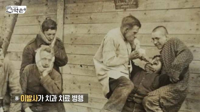 왼쪽 사진을 보시면요. 19세기 이전의 치과 모습을 나타낸 사진입니다. 사람들이 굉장히 고통스러워하고 있죠. 저 때에는 치과 의사 양성을 따로 하지 않았다고 합니다. 머리를 깎는 이발사들이 치아 발치라든지, 작은 수술이라든지 그런 것들을 병행했다고 합니다.