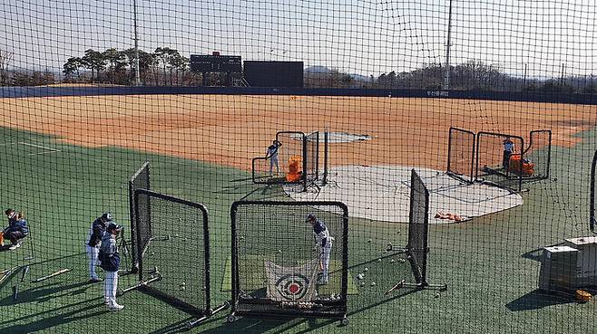 ▲ 지난해 이천 베어 스파크 실외구장에서 타격 훈련하는 두산 타자들