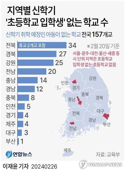 (서울=연합뉴스) 이재윤 기자 = 교육부는 이달 20일 기준으로 3월 신학기에 취학 예정인 아동이 없는 학교가 전국에서 157곳으로 나타났다고 26일 밝혔다.