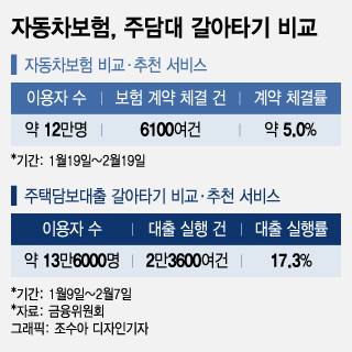 이는 주택담보대출(주담대) 갈아타기 서비스와 대조적이다. 주담대 대환대출 서비스는 지난달 9일 출시 이후 약 한 달간 13만6000명이 이용했다. 이용자 수는 자동차보험 비교·추천과 크게 차이 나지 않는다. 하지만 실제로 계약이 체결된 건수는 2만3600여건으로 자동차보험 계약 체결보다 약 4배 많았다.