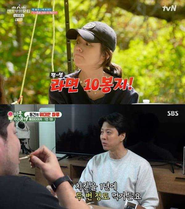 한가인과 이동건은 지난 25일 방송된 예능에서 각각 라면과 치킨을 거의 먹지 않는다고 밝혔다. 한가인은 tvN ‘텐트 밖은 유럽-남프랑스편’에서 라면을 먹다가 “원래 면을 잘 안 먹는다. 라면도 원래 안 먹는다. 지금까지 평생 먹은 양이 10봉지가 될까 싶다”고 밝혔다. 또 “콜라 등 탄산음료도 지금까지 태어나서 먹은 게 4캔 정도”라고 말했다.