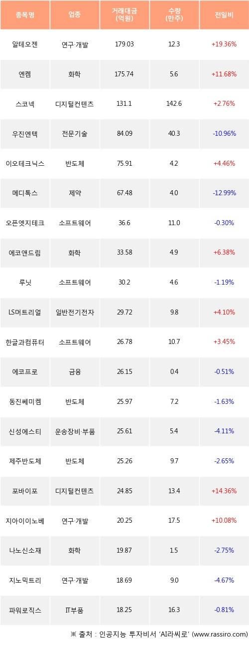 외국인 투자자의 순매수 상위 20개 종목은 알테오젠, 엔켐, 스코넥, 우진엔텍, 이오테크닉스, 메디톡스, 오픈엣지테크놀로지, 에코앤드림, 루닛, LS머트리얼즈등이다.