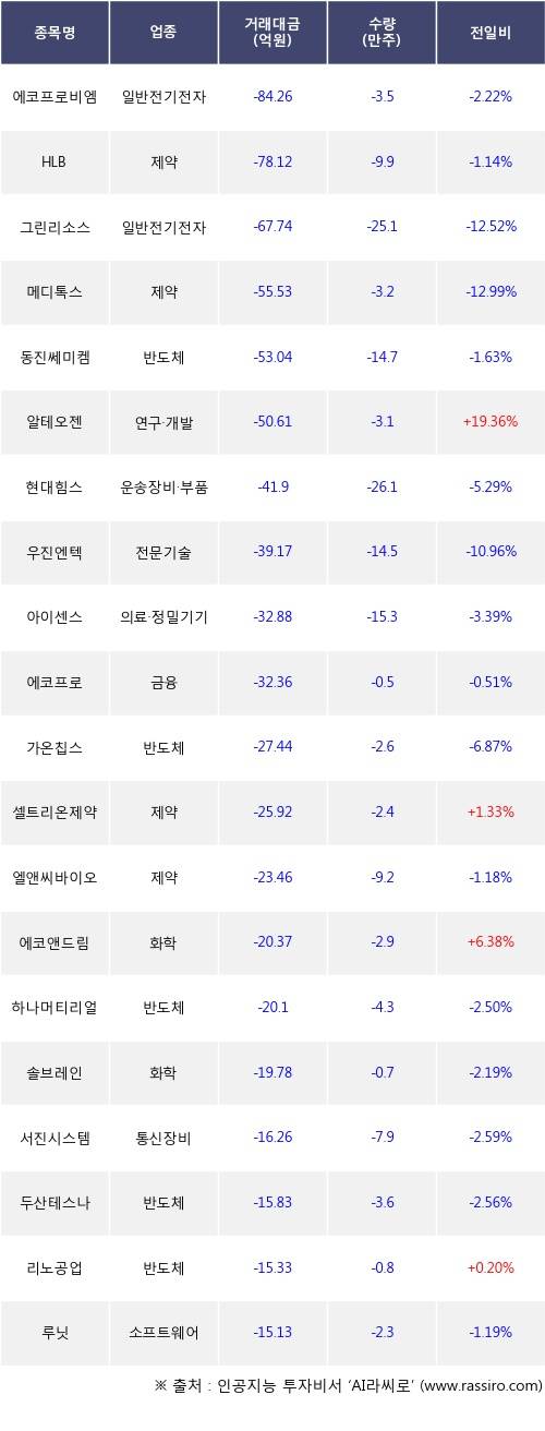 기관 투자자의 순매도 상위 20개 종목은 에코프로비엠, HLB, 그린리소스, 메디톡스, 동진쎄미켐, 알테오젠, 현대힘스, 우진엔텍, 아이센스, 에코프로등이다.