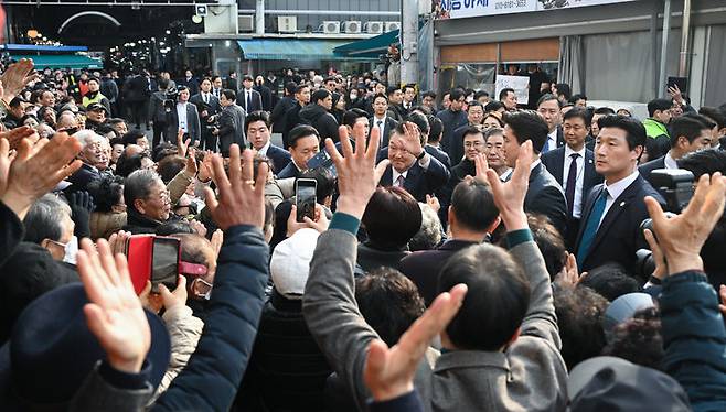 [서울=뉴시스] 윤석열 대통령이 26일 충남 서산 동부전통시장을 방문해 환영 나온 시민들에게 인사하고 있다. (사진=대통령실 제공) 2024.02.26. photo@newsis.com *재판매 및 DB 금지