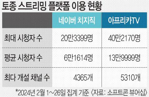 네이버는 최근 유튜브가 라이브커머스 등에 진출하면서 위기감이 커졌다. 기존 네이버가 강점을 보여왔던 서비스까지 유튜브에 밀리는 것 아니냐는 관측이 나온 것이다. 이에 네이버는 이용자 확보 지렛대로 치지직을 앞세웠다. 젊은층이 치지직을 이용하며 네이버에 오랫동안 머무르면 다른 서비스와의 시너지 효과가 난다. 광고 수입이 늘고, 커뮤니티나 커머스, 간편결제 등의 서비스로 유입을 늘릴 수 있기 때문이다. 아프리카TV는 트위치를 제치고 스트리밍 업계 1위에 올라섰다. 아프리카TV 최대 시청자 수는 치지직의 배 수준인 40만2170명에 달한다. 최다 방송채널 수도 5310개로 치지직에 앞섰다. 아프리카TV는 오는 5월까지 글로벌 플랫폼 ‘숲’을 출시하고 스트리밍 시장에서 존재감을 키우겠다는 전략이다.