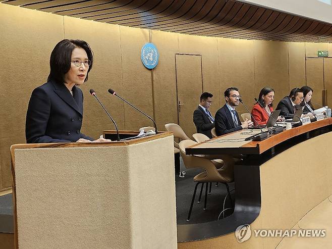 (제네바=연합뉴스) 안희 특파원 = 26일 유엔 제네바사무소에서 열린 유엔 군축회의 고위급 회기 전체회의에서 강인선 외교부 2차관이 연설하고 있다. 2024.2.27
